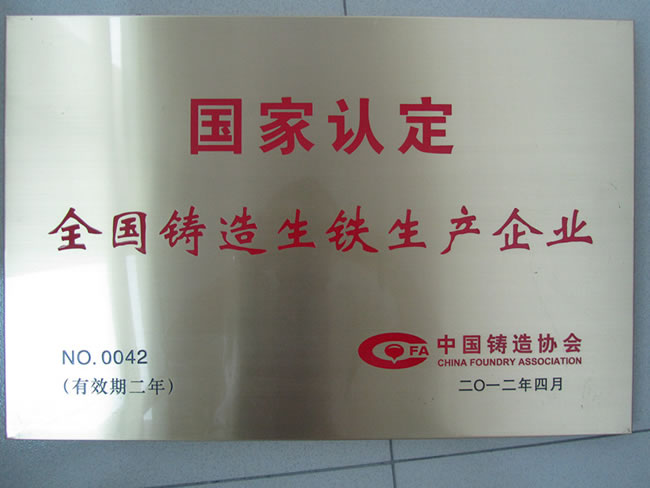 國家認(rèn)定全國鑄造生鐵生產(chǎn)企業(yè)
